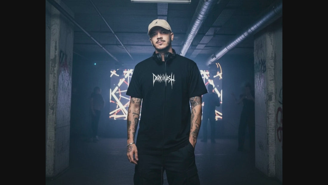 • Model trägt DarkXNASH Core Edition T-Shirt mit weißem Logo in Underground-Clubszene, kombiniert mit Streetwear Look und Techno-Vibes.